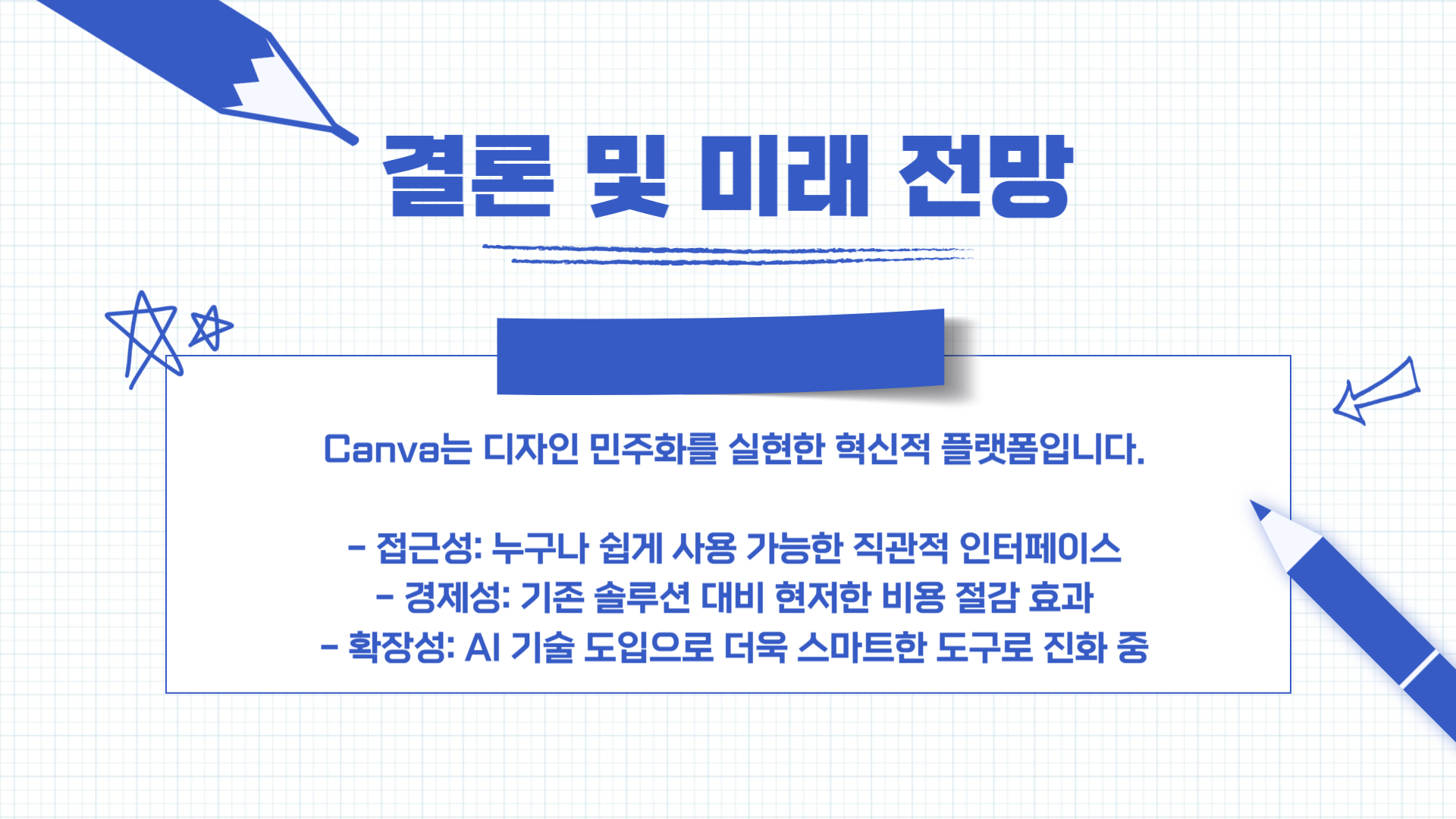 Canva는 지속적인 기능 개선과 AI 기술 도입을 통해 더욱 스마트한 디자인 도구로 발전하고 있습니다. 특히 자동 디자인 생성, 브랜드 가이드라인 자동 적용, 다국어 지원 확대 등의 기능이 예정되어 있어 향후 더욱 강력한 도구가 될 것으로 예상됩니다.