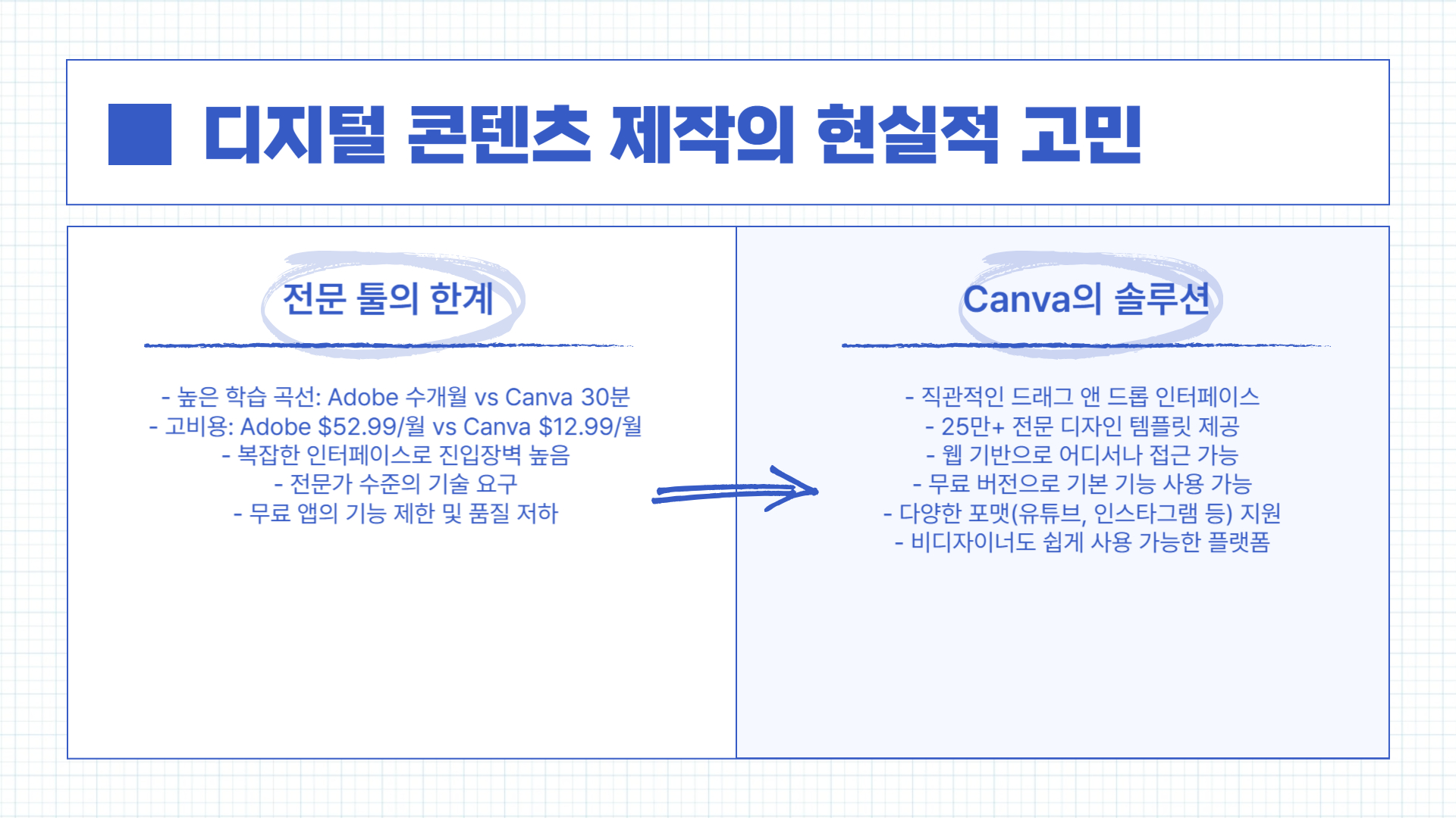 - 학습 곡선: Canva 30분 vs Adobe 수개월