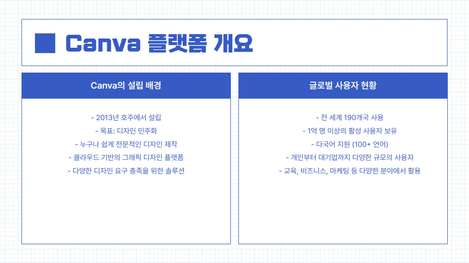 Canva는 2013년 호주에서 설립된 온라인 그래픽 디자인 플랫폼으로, 현재 전 세계 190개국에서 1억 명 이상의 사용자를 보유하고 있습니다.