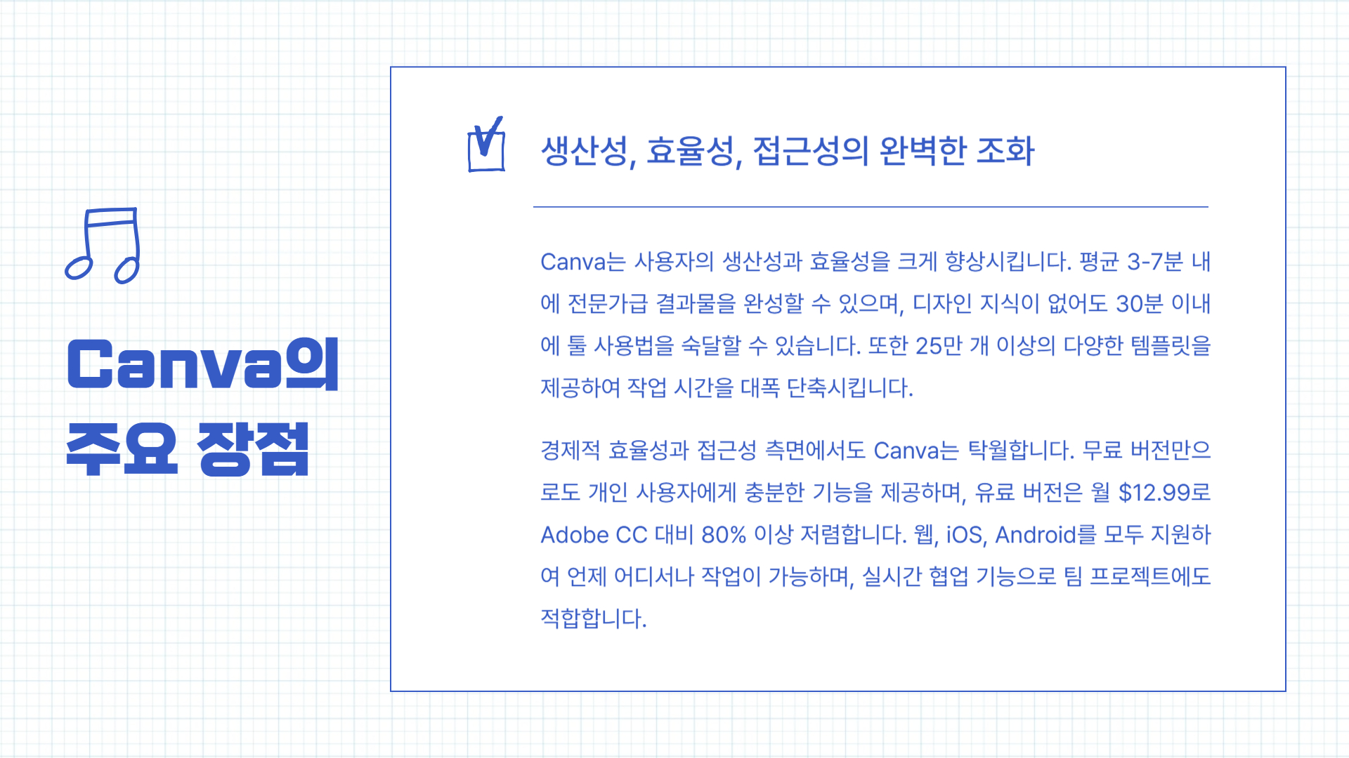 - 학습 곡선: Canva 30분 vs Adobe 수개월