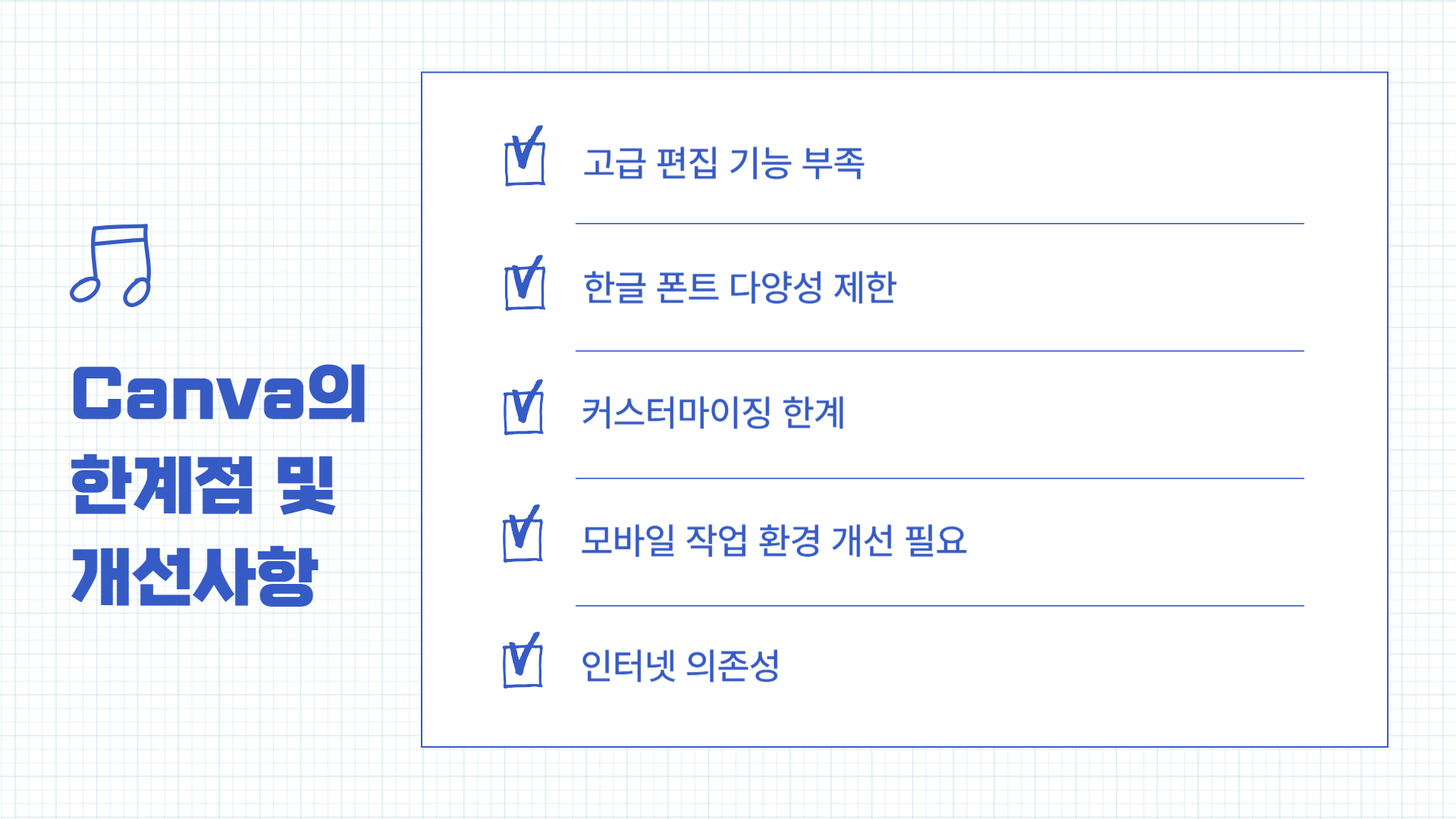 - 커스터마이징 한계: 완전한 자유도보다는 템플릿 기반 작업